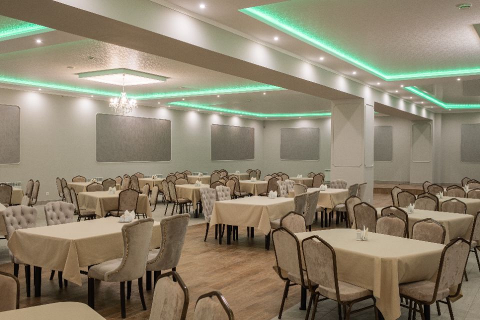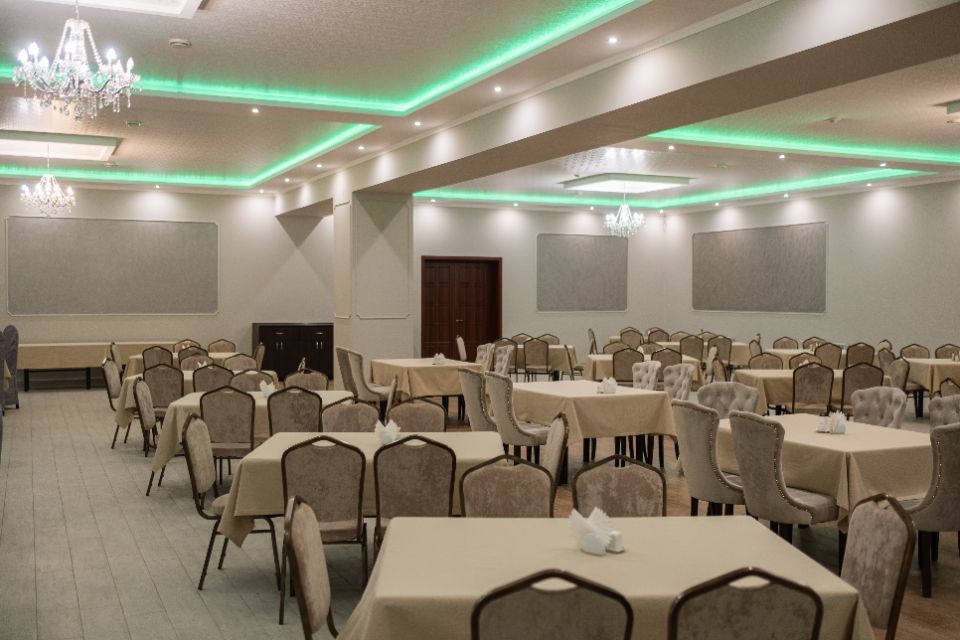 Стильный банкетный зал до 250 человек, оформленный в светлых тонах, создает атмосферу простора и элегантности для вашего идеального праздника.